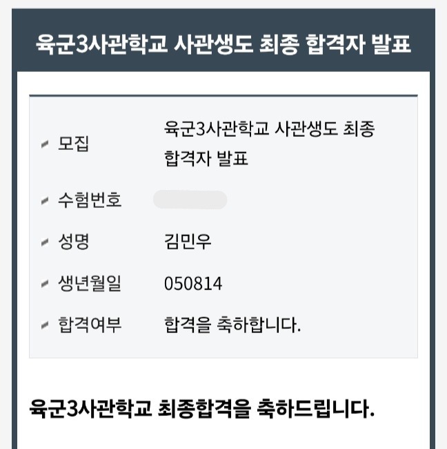 24학번 김민우 육군3사관학교 수관생도 최종 합격
